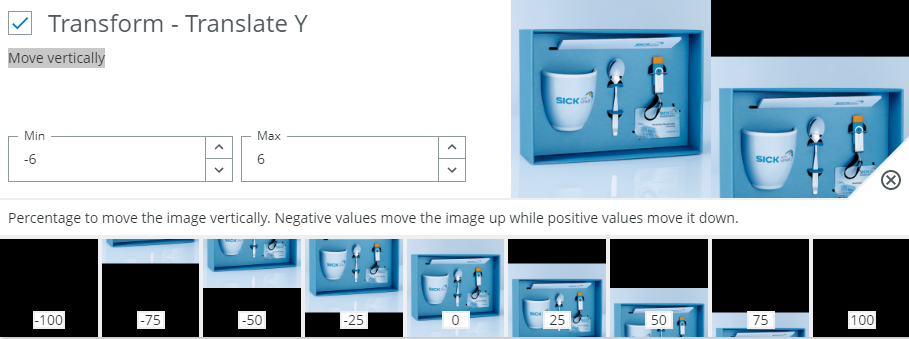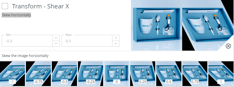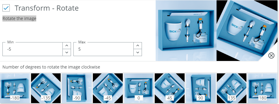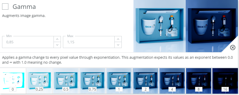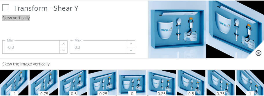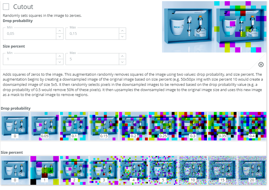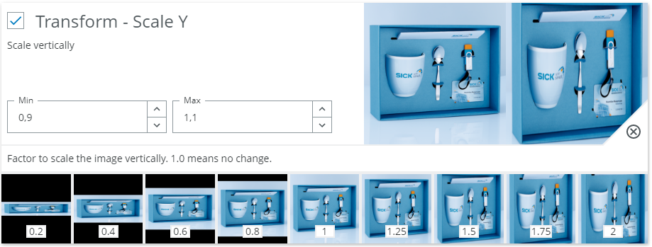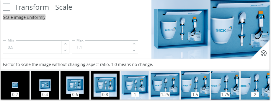 Example: If you expect the distance between camera and object to vary, you can activate the uniform scaling augmentation and define within which range you want the size to vary.